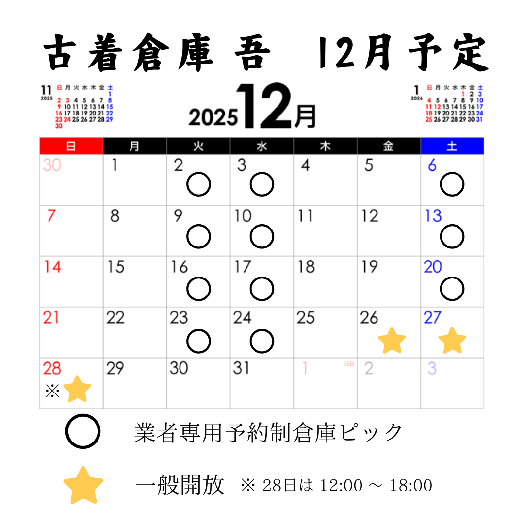 業者様向けの予約制倉庫ピックと、一般の方向けの一般開放とオンラインショップで古着を販売しています。